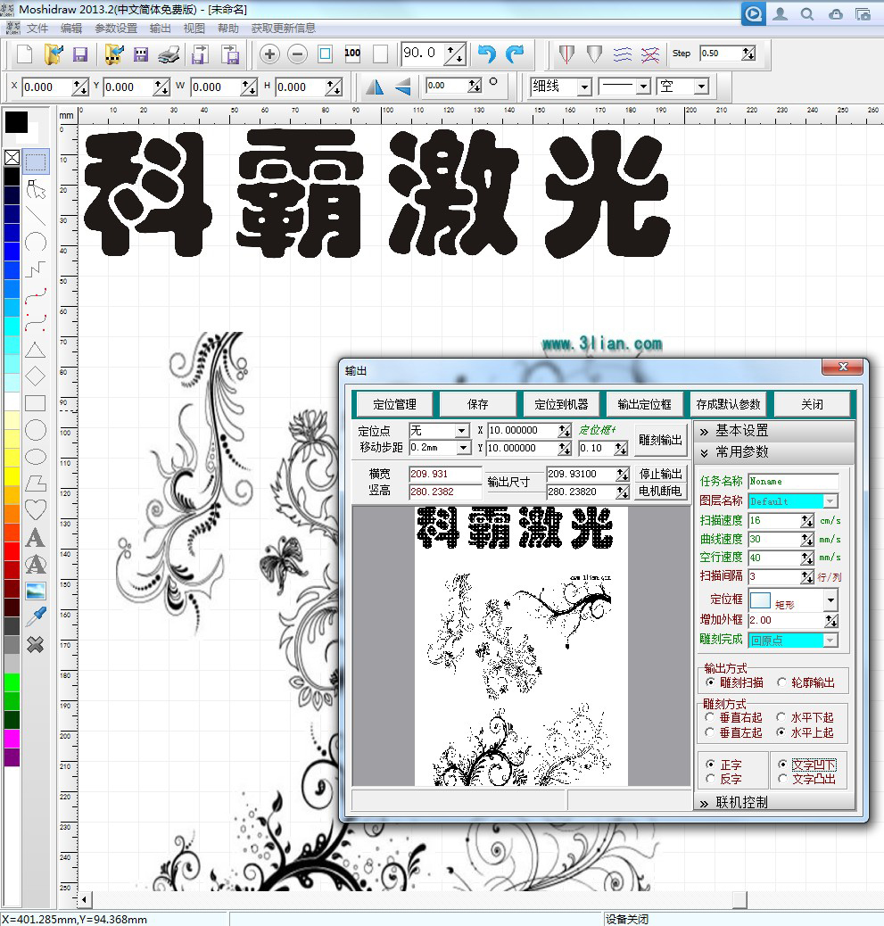 采用定位方式: 左上角定位,(有效縮短光路,雕刻更精確,更耐用)